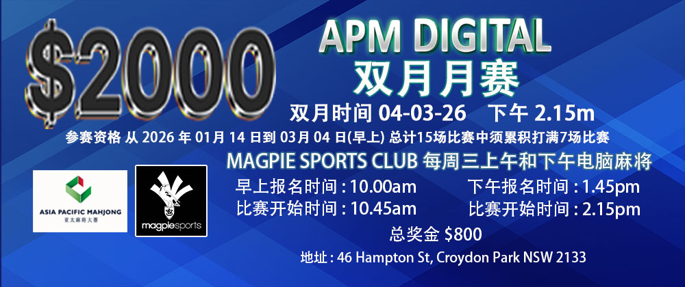 请注意,已获得 2020 年冬季麻将锦标赛门票并且不希望再参加2023年 APM Digital新年锦标赛的会员,请在 2022 年 11 月 15 日前通知我们的赛事工作人员,以便安排为您于 2022 年 12 月 3 日星期六在 Canterbury Hurlstone Park RSL 领取现金退款。而选择继续参赛的会员将争夺至少 $10,000 的现金大赛奖励,有机会成为 2023年中国新年麻将大赛(2020 年冬季麻将锦标赛)的冠军。