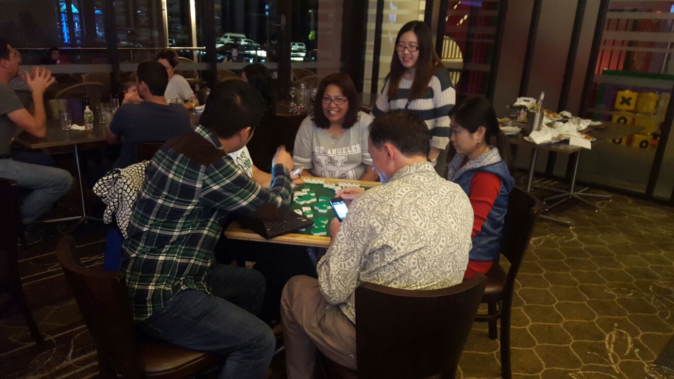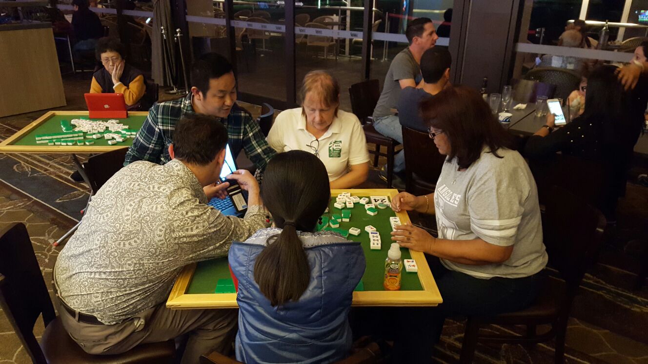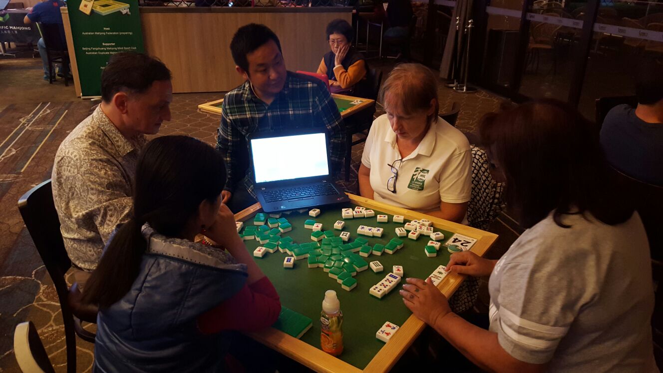 Wenlong Li and Panjing Song from China teach Mahjong players how to play GUOBIAO rules at Wentys